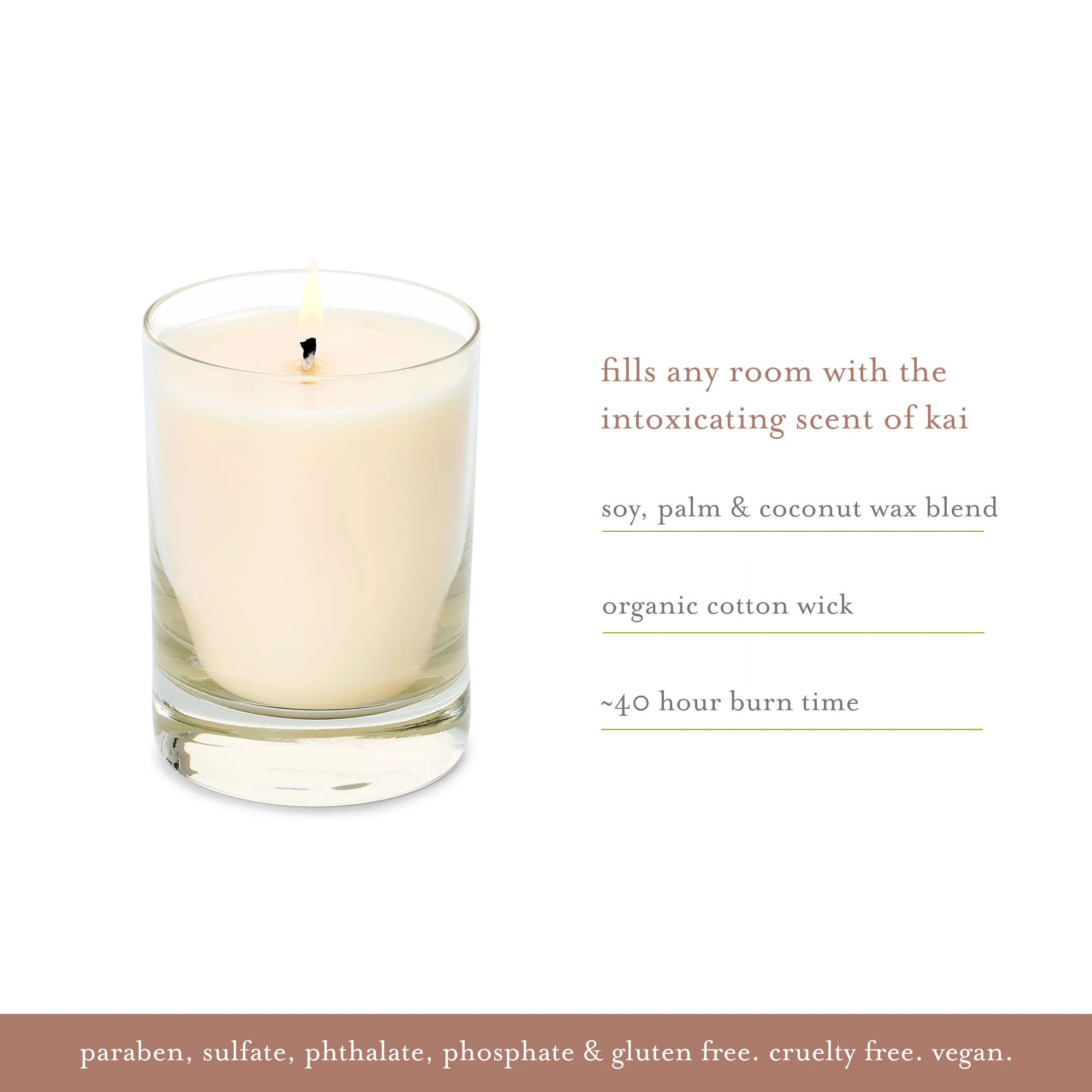 our largest slow-burning candle fills the room with the aura of kai's intoxicating scent of a gardenia top note wrapped in white exotics layered with rose absolute. crafted with a proprietary blend of soy, palm and coconut wax with an organic cotton wick.